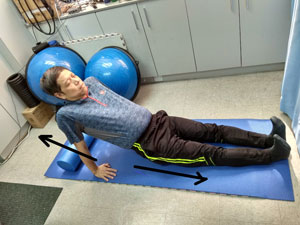 用力屈腳板來拉緊(固定)雙腿,撐肩收腹(用手稍微撐起上身,腰腹稍微向上,臀部會自然收緊來維持姿勢),這樣可以牽引腰椎,強化腰背、腹部、臀部、大小腿、肩和手,減低髖關節及腰椎內部的壓力。做完可用 foam roller 按鬆臀部及腰部肌肉。